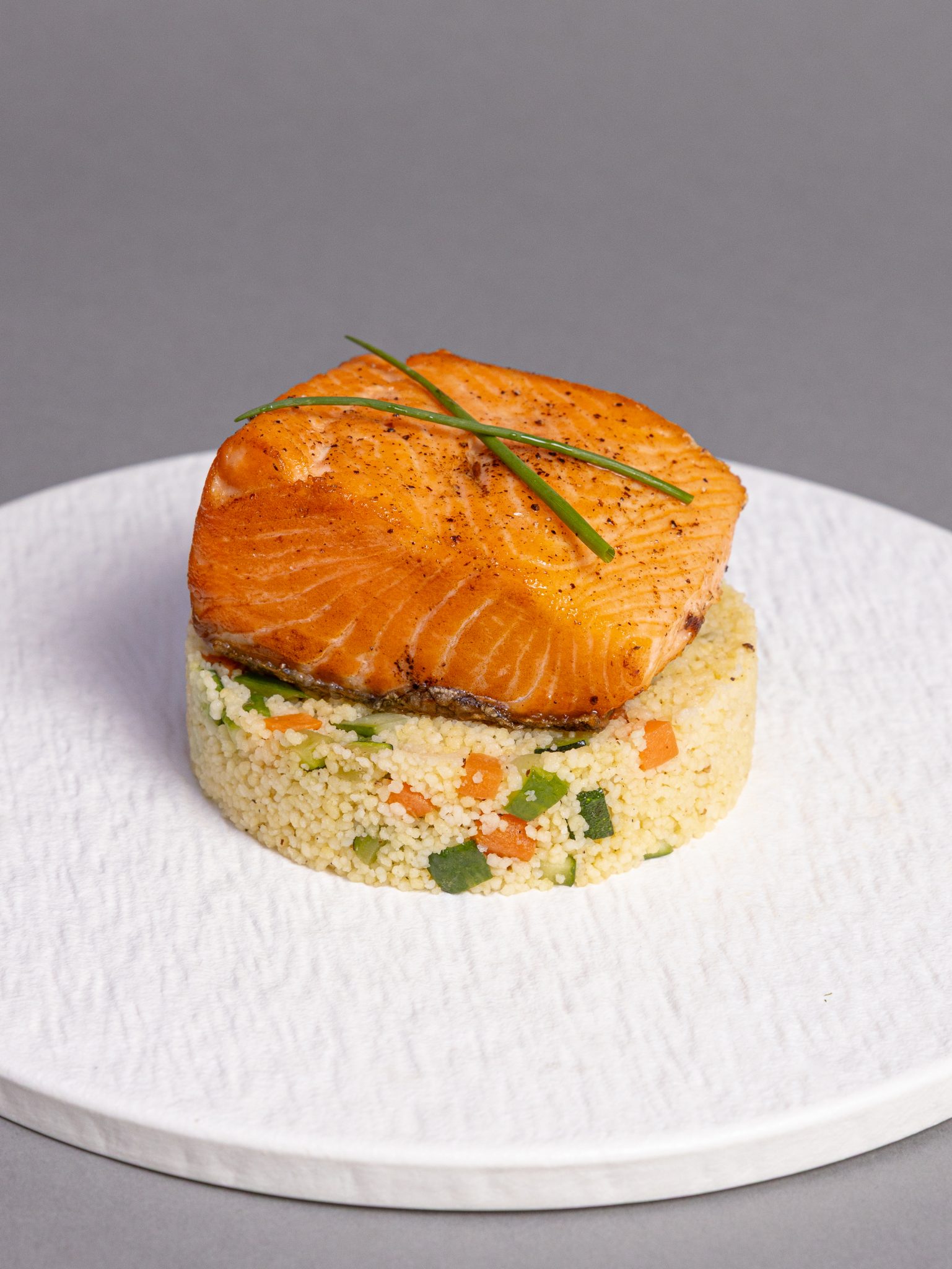 200g of Pan-seared Norwegian salmon cooked on light olive oil served over a fresh veggies couscous salad, finished with a light lemon butter dressing.