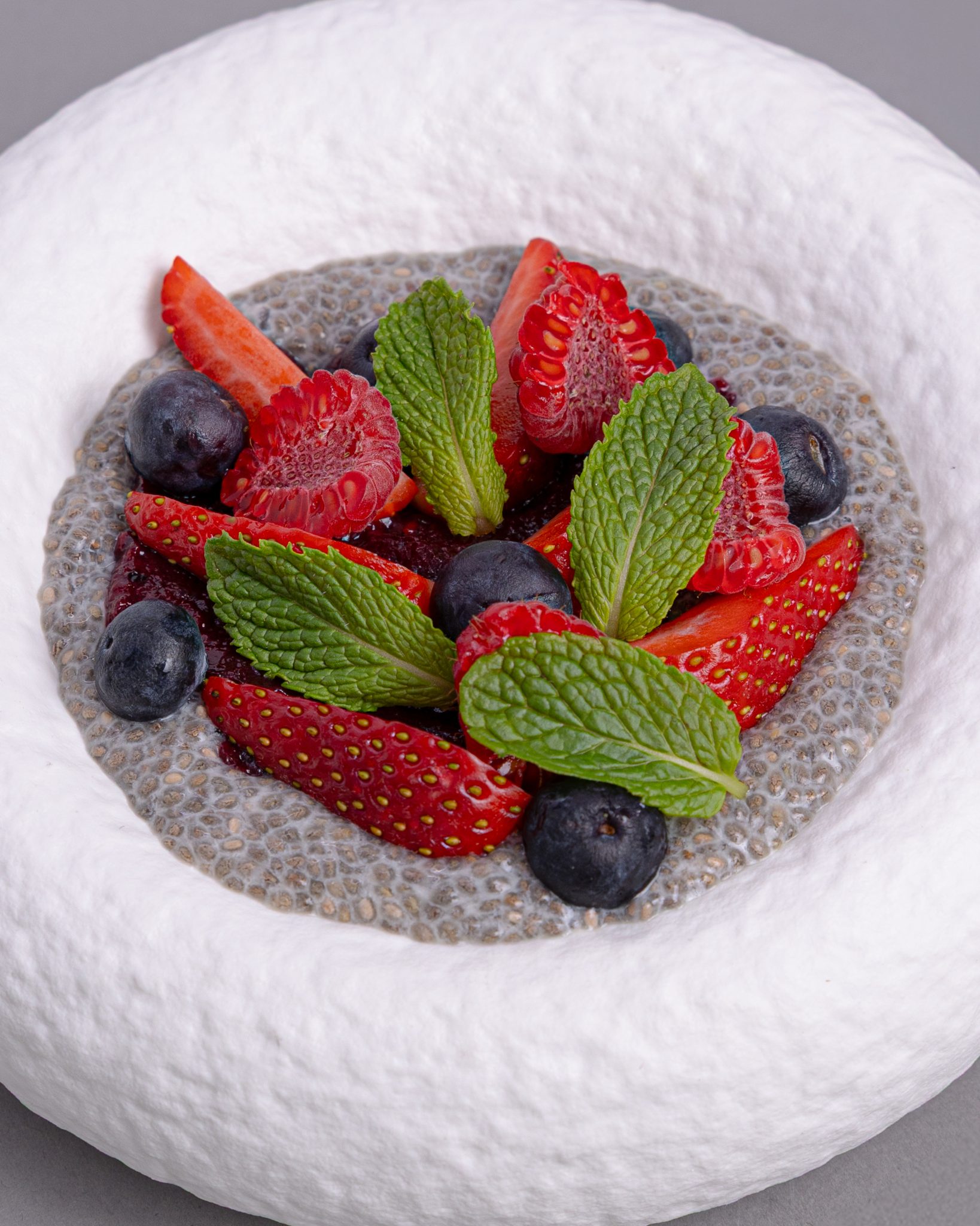 Chia seeds soaked overnight in almond milk, layered with our homemade organic jam sweetened with natural agave, and topped with fresh berries and flaxseeds. A nourishing vegan superfood for daily balance. Allergens: almond milk, nuts