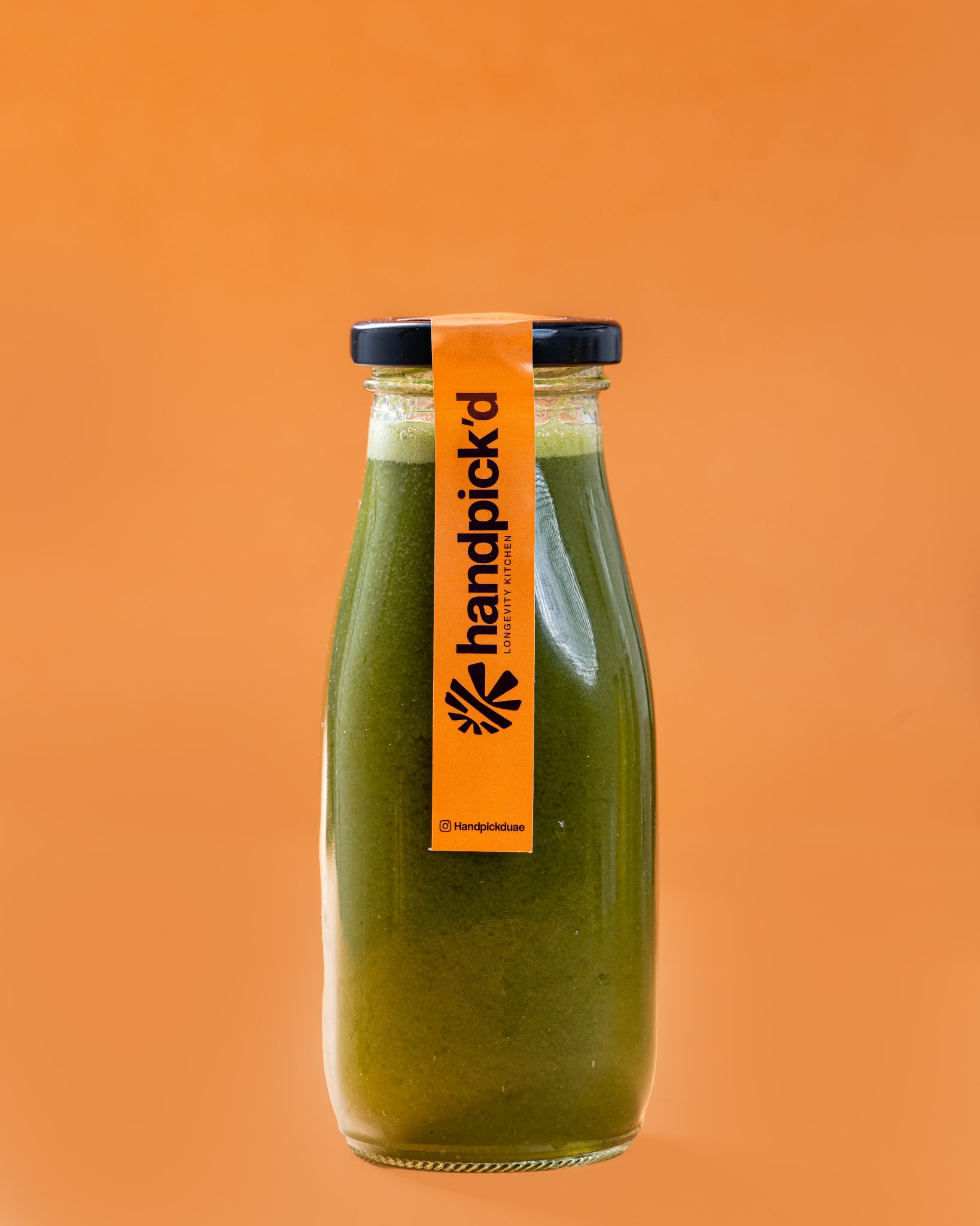 Freshly squeezed green juice with citrus, mint, and herbs for a refreshing daily detox. 100% natural.