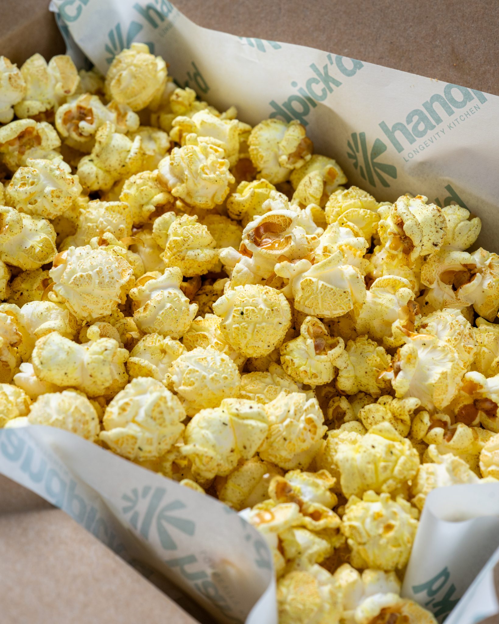 Umami & Herbs Air-popped popcorn with rosemary, thyme, garlic, nutritional yeast, and olive oil. Light, savory, and full of umami flavor for less than 200 calories. Allergens: none