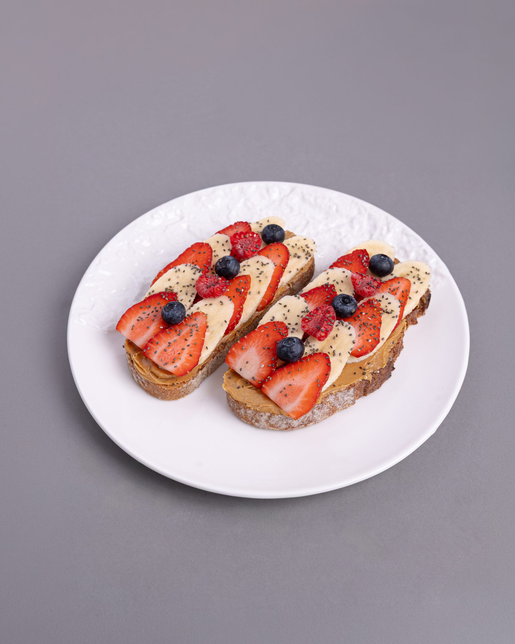 Organic buckwheat sourdough topped with freshly pressed peanut butter, sliced banana, mixed of berries and chia seeds