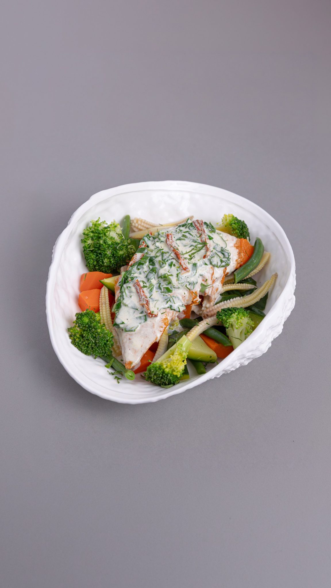 Organic free range baby chicken breast cooked in its very own chicken broth topped with low fat cream and homemade sun-dried tomatoes and butter sautéed vegetables.